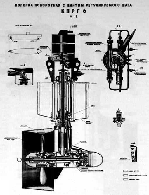 В качестве приводов колонок и насосного агрегата системы гидравлики были приняты те же асинхронные погружные электродвигатели переменного тока мощностью на валу 6 и 10 кВт, что и в проекте 1832, только статические преобразователи были предусмотрены в погружном исполнении и размещались в легком корпусе.