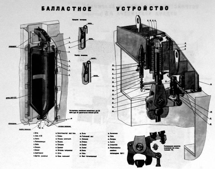 – из носового и кормового бункеров с литой чугунной дробью в обоих вариантах. Выпуском дроби из бункеров через электромагнитные клапаны ГА придавалась положительная плавучесть и необходимый дифферентующий момент.
