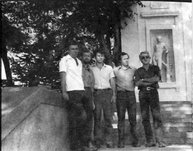 Члены испытательной партии A.П.Смирнов, Г.К.Писаренко, B.C.Комаров, В.Ф.Пекарников и Е.Н.Шанихин на Графской пристани. Севастополь, 1981 г.