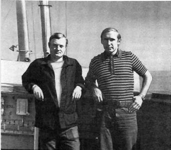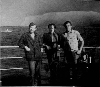 Члены испытательной партии Н.СЛеонтьев, В.Ф.Пекарников и А.П.Смирнов на борту “М.Рудницкого”, 1982 г.