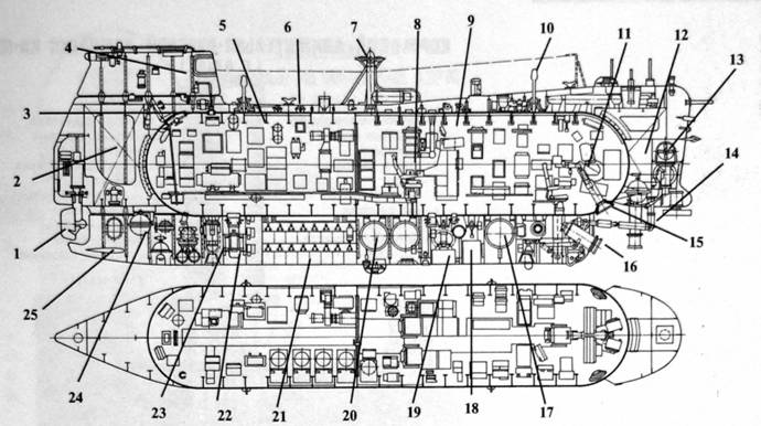 Общее расположение глубоководного аппарата “Поиск-2” проекта 1832. 1 – кормовая поворотная колонка; 2 – кормовая балластная цистерна; 3 – входной люк; 4 – ограждение входного люка; 5 – агрегатный отсек; 6 – прочный корпус; 7 – вертикальный винт регулируемого шага; 8 – пост командира; 9 – обитаемый отсек; 10 – спускоподъемное устройство; 11 – пост помощника командира по НИР; 12 – носовая балластная цистерна; 13 – горизонтальное подруливающее устройство; 14 манипуляторное устройство; 15 – носовые иллюминаторы; 16 – телевизионная камера; 17 – заместительная цистерна; 18 – контейнер твердого балласта; 19 контейнер вспомогательной аккумуляторной батареи; 20 – уравнительная цистерна; 21 – основная аккумуляторная батарея; 22 – насосный агрегат системы гидравлики; 23 – кормовой подводный якорь; 24 – кормовая дифферентная цистерна; 25 горизонтальный стабилизатор