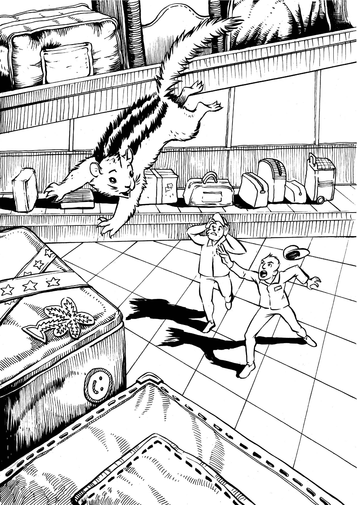 Выбрав момент, Сим прыгнул на растущую горку чемоданов. Оттуда он мог перескочить на ленту, затем ещё на одну и, наконец, добраться до Ма-миного чемодана. Но едва бурундучок примерился для следующего прыжка, тележка тронулась. Сим в ужасе увидел, что его билет на железную птицу снова удаляется. Тут горка чемоданов пошатнулась и вместе с бурундучком рассыпалась.