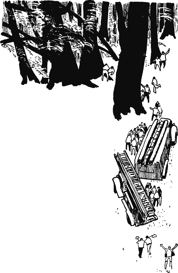 Просигналили сирены пожарных машин. Следом прикатил грузовик, и из него посыпались люди. Мимо мальчишек промелькнули разгоряченные лица. Люди с топорами, пилами и лопатами бросились к горящим деревьям.