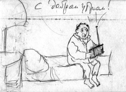 На стене на видном месте красовалась картинка под стеклом в обрамлении медицинского лейкопластыря. Она и сегодня украшает уже мой кабинет. Авторство принадлежало драматургу-художнику. На рисунке, сделанном Исидором, – растрепанный человек, полуодетый в пижамную пару, сидящий на кровати, со спущенными босыми ногами и с испуганными глазами. В руках у него судорожно сжимаемый радиоприемник «Спидола» с вытянутой до отказа антенной. Наверное, гражданин ловит волны радиостанции «Голос Америки», пробивающиеся сквозь глушилки. Чтобы удостовериться во времени происходящего, автор автошаржа надписал сверху карандашом: «С добрым утром!»