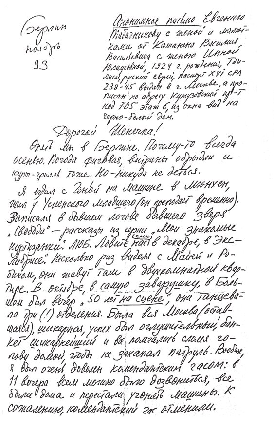 Анонимное письмо Евгению Табачникову с женой и малютками от Катаняна Василия Васильевича с женою Инной Юлиусовной, 1924 г. рождения, Тбилиси, русский еврей, паспорт XVI СРЛ 238-45 выдан в г. Москве, а прописан по адресу Кутузовский пр-т код 705 этаж 6, из окна вид на черно-белый дом.