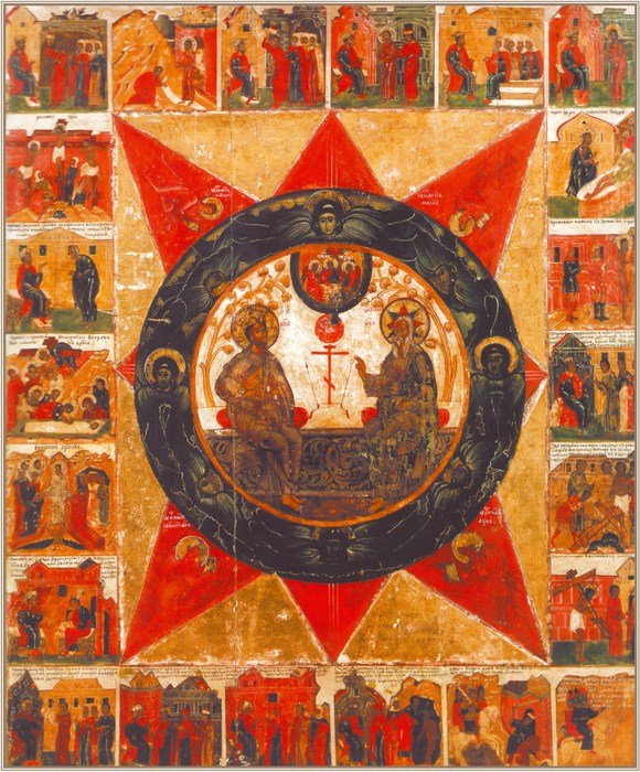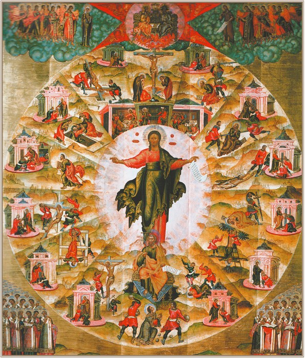 В древнерусском храме не одни церковные главы, самые своды и сводики над наружными стенами, а также стремящиеся кверху наружные орнаменты зачастую принимают форму луковицы. Иногда эти формы образуют как бы суживающуюся кверху пирамиду луковиц. В этом всеобщем стремлении ко кресту все ищет пламени, все подражает его форме, все заостряется в постепенном восхождении. Но только достигнув точки действительного соприкосновения двух миров у подножия креста, это огненное искание вспыхивает ярким пламенем и приобщается к золоту небес. В этом приобщении – вся тайна того золота иконописных откровений, о котором мы уже достаточно говорили: ибо один и тот же дух выразился в древней церковной архитектуре и живописи.