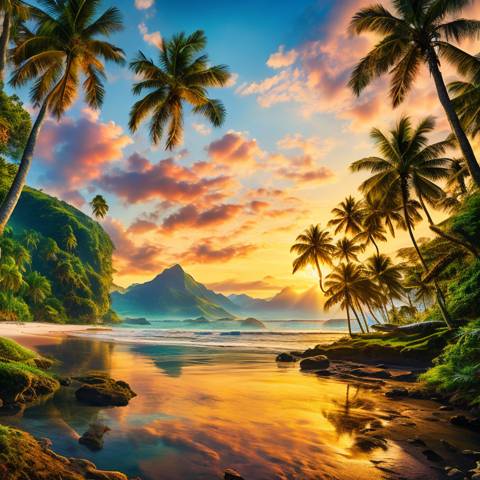 Открыв их, я увидел изумрудного цвета залив, с глубиной приобретавший темно-синий оттенок. Неторопливые волны шуршат пестрой галькой, теплый ветер качает пальмы, воздух пахнет йодом, морем и сумасшествием. Потому что помню, что всё еще в зале, а там моря нет.