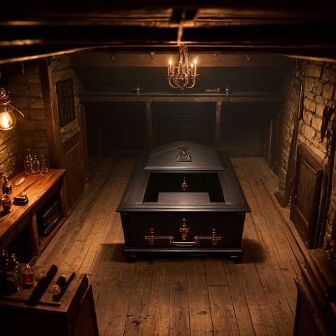 Подпол оказался на удивление чистым. На столе колбы, склянки, реторты с чем-то подозрительно красным. Но главное – в центре. Там стоял гроб.
