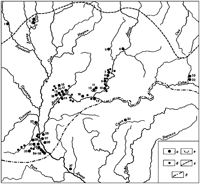 1 – Щатково; 2 – Тайманово; 3 – Абидня; 4 – Новый Быхов; 5 – Посудичи; 6 – Кветунь; 7 – Форостовичи; 8 – Дегтяревка (Лавриков Лес); 9 – Мезин; 10 – Вишенки; 11, 12 – Киреевка I, II; 13 – Долинское; 14 – Выбли; 15 – Роище; 16 – Мена 5; 17 – Клочков; 18 – Деснянка; 19 – Ульяновка I, II; 20, 21 – Киселевка I, II; 22 – Букреевка II; 23 – Каменево II; 24 – Беседовка; 25 – Казаровичи; 26 – Погребы; 27 – Красный Хутор; 28 – Вишенки; 29 – Белогородка; 30 – Глеваха; 31 – Ходосовка; 32 – Большая Салтановка (Хлепча); 33 – Новые Безрадичи; 34–36 – Обухов II, VII; 37 – Сушки II.
