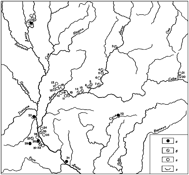 1 – Тайманово; 2 – Абидня; 3 – Кветунь; 4 – Форостовичи; 5 – Дегтяревка (Лавриков Лес); 6 – Мезин; 7 – Вишенки; 8, 9 – Киреевка I, II; 10, 11 – Салтыкова Девица I, II; 12 – Выбли; 13 – Роище; 14 – Мена 5; 15 – Максаки; 16 – Деснянка; 17 – Ульяновка; 18, 19 – Киселевка I, II; 20 – Букреевка 2; 21 – Каменево II; 22 – Беседовка; 23 – Казаровичи; 24 – Погребы; 25 – Красный Хутор; 26 – Вишенки; 27 – Глеваха; 28 – Ходосовка; 29 – Большая Салтановка (Хлепча); 30 – Новые Безрадичи; 31–33 – Обухов II, III, VII; 34 – Сушки II.
