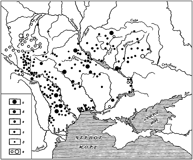 а – 100 и более погребений; б – 50 и более погребений; в – 20 и более погребений; г – 10 и более погребений; д – единичные погребения; е – памятники, отношение которых к черняховской культуре ставилось под сомнение.