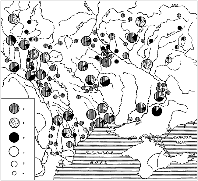 Карта 26. Распространение различных типов захоронений черняховской культуры (по Г.Ф. Никитиной).