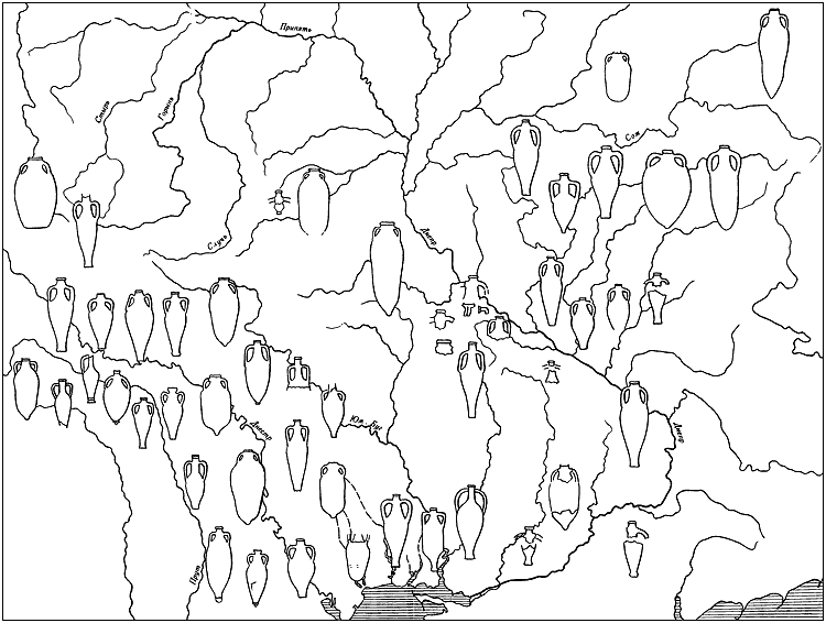Почти нет черняховских поселений, на которых бы не находили обломков глиняной тары античных городов – амфор (табл. LXXXII; карта 28). В них привозили вино и масло. Не исключено, что из лесостепи и степи в них же в обмен вывозили зерно, мед и т. д. Доля обломков амфор по отношению к местной лепной и круговой посуде, как правило, только в отдельных случаях составляет 20–30 %. Они никогда не превалируют. Обычно лишь в могильниках, ближайших к берегам Черного моря, находят целые амфоры, хотя и на поселениях есть целые сосуды (Кринички, Киселово и др.) (Сымонович Э.А., 1960б, с. 247, рис. 6, 70). Вероятно, из-за трудностей транспортировки на черняховские земли привозили обычно амфоры средних размеров (светло– и красноглиняные). Они попадали и далеко на север, как свидетельствуют раскопки на поселениях Курской обл., в Посеймье. Хронологический диапазон привезенных амфор – I–II – IV–V вв. Чаще всего использовали амфоры типа танаисских второй половины II–III в., инкерманские, типичные для IV в. н. э. на поздних этапах – амфоры типа Делакеу, которые выходят за рамки IV в. н. э., встречаясь на памятниках первой половины V в. н. э. К раннему времени относятся обломки двуствольных амфор из Луки-Врублевецкой, Лесок и амфоры типа Балцаты с высоким, почти цилиндрическим горлом (Рикман Э.А., 1972, с. 88, рис. 1, 2, 3). Интерес представляют разновидности амфор с левобережья, датируемые III–IV вв. (Сымонович Э.А., 1964а, с. 28, рис. 3) и более западные находки из Поднестровья (Кропоткин В.В., 1970б, с. 45–47). На многих амфорах имеются граффити, знаки или греческие буквы, нанесенные красной краской до их продажи северным «варварам» (Рикман Э.А., 1972, с. 89, рис. 2).