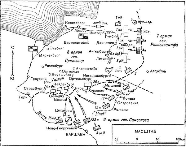 На германском фронте, против Восточной Пруссии, развернулись две русские армии (схема 1): 1-я армия генерала Ренненкампфа, в составе трех с половиной корпусов с несколькими второочередными дивизиями, и пять с половиной кавалерийских дивизий, по Неману на фронте Ковно – Олита с выдвинутыми вперед прикрывающими частями; 2-я армия генерала Самсонова, в составе четырех с половиной корпусов и трех кавалерийских дивизий, на фронте Августов – Остроленка – Ново-Георгиевск, имея кавалерию перед фронтом и на флангах. Кроме того, для прикрытия 2-й армии со стороны Торна в состав ее были назначены: 1-й корпус; сосредоточенный в Ново-Георгиевске, и гвардейский – в Варшаве.