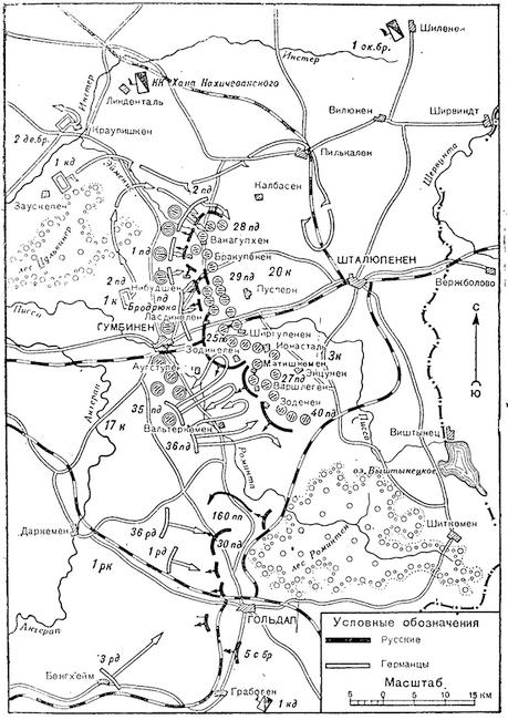 По распоряжению Притвица, 1-й германский корпус с дивизией конницы был собран севернее Гумбинена; 17-й корпус перевезен из района Млавы в районе южнее Гумбинена – 35-я дивизия к северу, а 36-я дивизия к югу от Вальтеркемена; около трех ландверных дивизий перевезены из района Тильзита и Кенигсберга 8 район Краупишкен; части 1-го резервного корпуса двинуты на Гольдап; некоторые части 20-го корпуса притянуты также в район Гумбинена.