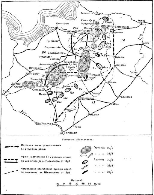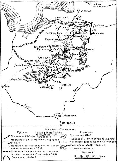 Ко времени прибытия Гинденбурга и Людендорфа на Восточный фронт русская армия Ренненкампфа, очень медленно следуя за отступавшими после Гумбиненского сражения немцами и теряя с ними соприкосновение, не достигла еще Инстербурга, а Наревская 2-я армия Самсонова дошла до линии Ортельсбург – Нейденбург – Сольдау, уклонившись несколько на запад от направления на Растенбург – Зеебург, заданного ей фронтовым командованием.