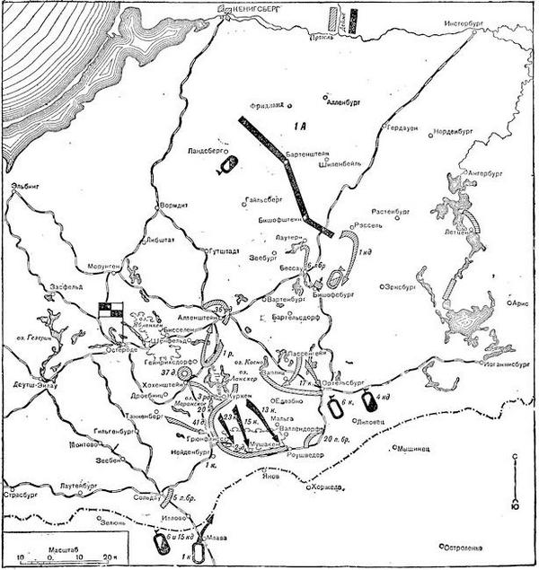 Лишь крутой поворот всей 1-й русской армии на фронт Зеебург – Бишофсбург мог иметь действительное значение для оказания помощи 2-й армии. Но Ренненкампф был, очевидно, увлечен идеей обложения Кенигсберга, против которого держал два корпуса, и для содействия 2-й армии предпринял оперативные шаги, не дающие нужных результатов.