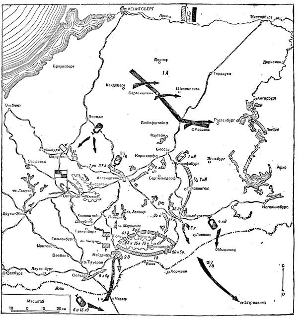 19 августа 1914 г. 25-я и 29-я пехотные дивизии русских разгромили левый фланг 1-го германского корпуса; 20 августа под Гумбиненом были разбиты 1-й и 17-й корпуса немцев; в период августовского сражения русские армии Самсонова разбили 6-ю и 70-ю ландверные бригады у Мюлена и Гросс-Бессау, ландверную дивизию Гольца и 3-ю резервную дивизию у Хохенштейна, 41-ю пехотную дивизию у Ваплица, 37-ю пехотную дивизию у Лана, Орлау, Франкенау, 2-ю пехотную дивизию под Уздау. Но отдельные блестящие тактические успехи русских войск не были увязаны в общую победу.