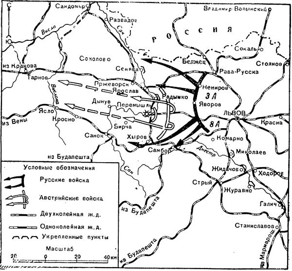 Потерпевшие поражение в Галицийской битве австро-германские армии отходили за реки Днестр и Сан. Русские армии Юго-Западного фронта вышли к 27 (14) сентября 1914 г. передовыми частями на линию от устья р. Сан до верховья р. Днестр у г. Самбор, имея рядом 3-ю и 8-ю армии – первую из них на фронте Немиров, Яворов, вторую на фронте Яворов, Комарно (схема 7).