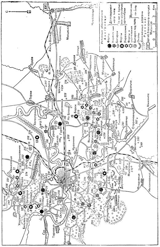 Крепость Перемышль имела внутреннюю ограду, которая прикрывала непосредственно переправы через р. Сан и могла обеспечить от нечаянного нападения жизненный центр крепости, и внешний фортовой пояс, вынесенный от центра крепости на расстояние от 4 до 10 км, имевший по обводу до 43 км и состоявший из 15 фортов и 25 опорных пунктов для пехоты и батарей, расположенных в промежутках между фортами (схема 8). Сила сопротивления крепости была сосредоточена на внешнем фартовом поясе, преодолеть который возможно было лишь при наличии осадной артиллерии крупных калибров.