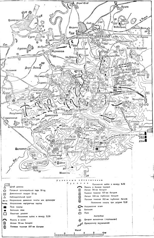 «…Полевая и тяжелая артиллерия содействует наступлению пехоты, обстреливая все атакуемые окопы, лишая противника возможности показаться и открыть огонь. Часть артиллерии действует против батарей противника, особенно мешающих наступлению нашей пехоты. Тяжелая артиллерия, помимо выполнения специальных задач, указанных каждому дивизиону генералом Дельвигом, частью батарей переносит огонь на тяжелые батареи австрийцев, открывающие огонь по пехоте, и сосредоточенным огнем обрушивается на них».