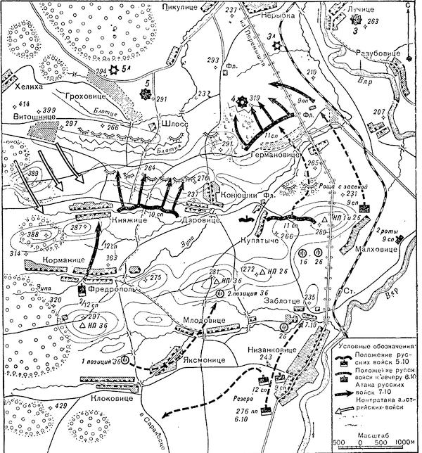 а) На участке главной атаки: 58-я пехотная дивизия по высотам восточнее дороги Медыка – Быкув, 19-я пехотная дивизия – от выс. 261 (на западной опушке Вельки-Ляс) к востоку от Быкув (через выс. 281) у Плешовнце (до р. Бухла), 69-я пехотная дивизия по высотам в районе Ходновице – Тышковице и 60-я пехотная дивизия по гребню высот у Лисковице, выс. 256 (у Велюннце), р. Вяр.