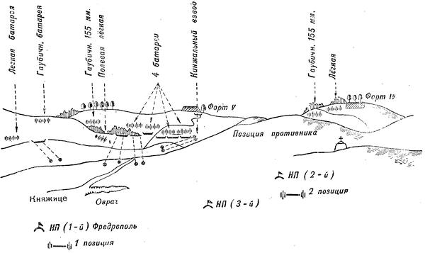 В 2 часа ночи 3-я батарея заняла позицию за выс. 281, имея наблюдательный пункт командира на этой высоте. В 3 часа командир батареи получил общую задачу от командира 10-го полка поддержать атаку полка на форт 5. Огонь был открыт около 7 часов, когда стало почти светло. С наблюдательного пункта командира батареи обнаружены были (см. копию панорамного чертежа на схеме 12) семь полевых легких батарей противника, две гаубичные и одна тяжелая, а на линии фортов 4 и 5 и впереди них по берегам р. Блотня видно было много различного типа укреплений. Огонь был открыт по тяжелой гаубичной батарее, обнаруженной западнее и несколько сзади форта 4, затем по внутреннему дворику этого форта. Вскоре, по указанию командира 10-го полка, огонь был сосредоточен по редуту южнее д. Витошница и по редуту возле и западнее дороги из Фредрополь к форту 5, затем по двум батареям, расположенным по одну и другую сторону той же дороги, сильно обстреливавшим передовые части 2-го батальона 10-го полка. Стрельба велась полубатареями одновременно по обеим батареям, огонь которых затих, что позволило атакующей пехоте продвигаться вперед. В дальнейшем батарея исполняла все задачи, указываемые командиром 10-го полка. Задач давалось много, приходилось обстреливать укрепления противника на фронте протяжением около 6–7 км, бороться с десятью неприятельскими батареями. Разумеется, что одна легкая батарея при таких условиях не была в состоянии оказать сколько-нибудь существенную поддержку своей пехоте. Огонь ее рассеивался по всему широкому фронту противника и потому нигде не мог быть достаточно сильным, не говоря уже о том, что форты и укрепления были вообще неуязвимы для 76-мм пушек. Командир батареи доносил начальству: «…сожалею, что у меня только одна батарея, а не шесть». Между тем без наличия тяжелой артиллерии крупных калибров не только шесть, но и в несколько раз большее количество легких батарей не могло бы справиться с задачей подготовки штурма долговременных фортов и других крепостных сооружений.