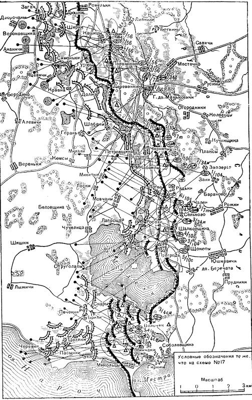 а) Начать артиллерийскую подготовку 18 марта с 8–9 часов, как только прояснится туман, и сначала демонстративно в течение трех часов обстреливать участок оз. Можейское, д. Новый Двор (участок этот южнее района атаки), «обстреливая одновременно с особым вниманием участок Матишки, Бучелишки, Лапинский лес[123], особенно последний, и 2-ю линию обороны».