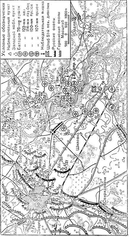 На стыках корпусов и дивизий установлена была взаимная артиллерийская поддержка. Относительно помощи артиллерии на правом фланге всего участка атаки было сообщено инаркорам соседней, что на этом фланге, ввиду малочисленности оставшейся артиллерии 20-го корпуса, может быть организована лишь борьба с неприятельской артиллерией в районах Светляны и Минки[138], Осиновка, причем в отношении последнего участка русские батареи стояли на предельной дистанции, а более близких позиций не было. На левом фланге вся тяжелая артиллерия 3-го корпуса (одна батарея 152-мм пушек в 120 пуд. и две батареи 122-мм гаубиц) и часть легких батарей привлечены были к содействию 38-му корпусу (об этом упоминалось выше). Тяжелые батареи 3-го корпуса получили задачу разрушения неприятельских окопов на участке Луковые, Геверишки и совместно с легкими батареями уничтожения фланговой обороны противника со стороны леса к западу от Геверишки; на легкие батареи, кроме того, возложена была борьба с неприятельской артиллерией в районе Куты, Конты.
