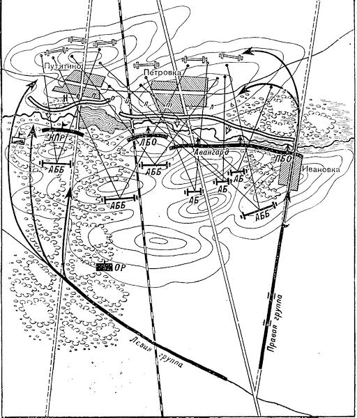 б) Правая группа (колонна) войск, по большей части из кавалерии с конной артиллерией (теперь главным образом танки, самоходные орудия, моторизованная пехота, автоматчики); направлялась через д. Ивановка (см. схему 1) на д. Петровка для удара в тыл противника, с охватом и глубоким обходом его левого фланга. При этом выдвижение правой группы рассчитывалось по времени так, чтобы она начала наступление для удара в обход левого фланга неприятеля ранее, чем закончится подход к исходному рубежу и развертывание левой группы, имея при этом в виду ввести неприятеля в заблуждение относительно направления главного удара и побудить его подтянуть свои резервы к своему левому флангу. О таком своем намерении старший общевойсковой начальник не должен был ставить в известность командующего правой группой, с тем чтобы этот последний действовал с полной энергией, считая поставленную ему задачу важнейшей – нанести противнику главный, решающий удар в его левый фланг и в тыл.