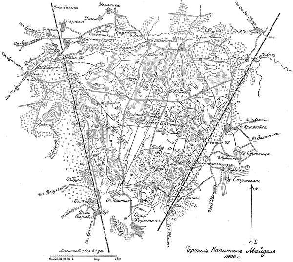 Ниже приводятся примеры заданий для групповых стрельб офицерской артиллерийской школы на Двинском полигоне в 1906–1907 гг. (см. схему 2, план Двинского полигона в масштабе 1 верста и дюйме)[60].