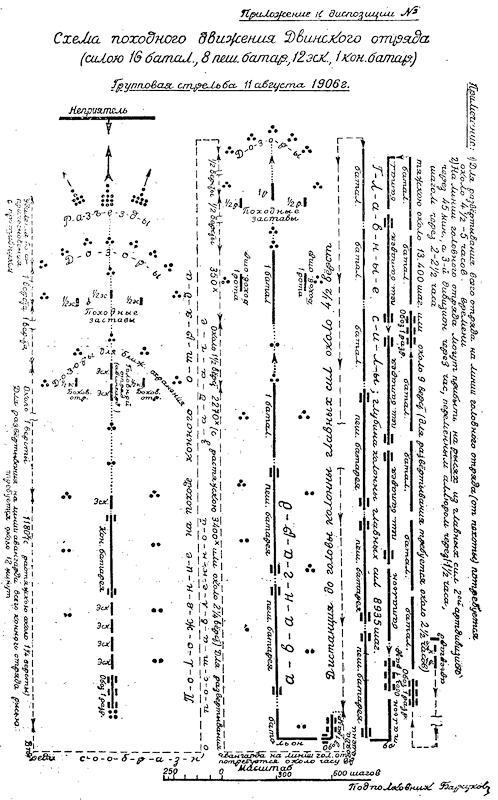 Накануне стрельбы 10 августа сообщались: а) диспозиция – Двинскому отряду (копия прилагается), всему руководящему персоналу школы и тем офицерам переменного состава школы, которые назначались исполнителями обязанностей: начальника отряда (старшего общевойскового начальника), начальника конницы, начальников авангарда и главных сил, начальника артиллерии (командира артбригады или старшего артначальника), командиров дивизионов, легких и конной батарей; б) ход маневра (копия прилагается) – только руководящему персоналу школы с приложением схемы расположения мишеней (копии схемы мишеней нет; на схеме мишени обозначались номерами, а на местности – флагами, макетами целей, вспышками, постройками из досок и фанеры, как, например, упоминаемый в ходе маневра "Белый дом", подвижными мишенями с макетами, изображающими всадников, и пр.).