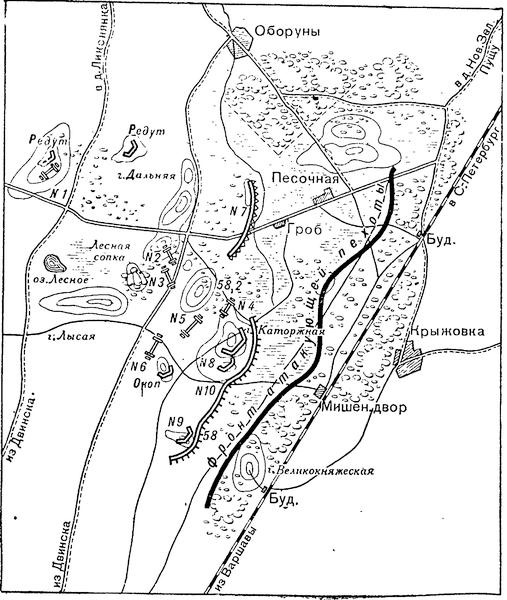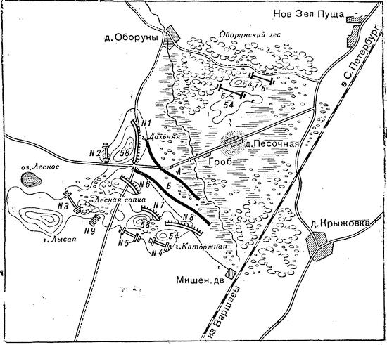 Наши наступающие авангарды (правой колонны дивизии – от д. Крыжовка; левой колонны дивизии – от д. Жулика), перейдя линию СПБ-Варшавской железной дороги у д. Крыжовка и у горы Великокняжеская, были остановлены в 8 час. утра артиллерийским и ружейно-пулеметным огнем противника, занявшим фронт – высота 58, гора Каторжная, д. Песочная (мишенная).