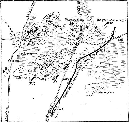 Произведенная нами вчера (на третий день боя) атака на гору Дальняя успеха не имела; к вечеру 7 августа наша пехота отошла до линии Окоп, высота 58,2, Гроб, юго-западная опушка Оборунского леса; наша артиллерия осталась на прежних позициях, занятых на рассвете 7 августа.