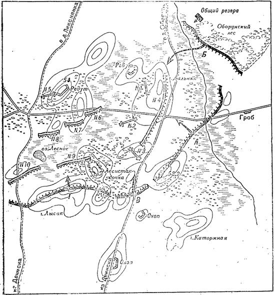 Вверенному мне отряду завтра, 19 сего августа, продолжать наступление с целью овладения крепостью-складом Двинск. 1. Конница 1. Выступить с рассветом через д. Песочная (мишенная) и Гроб и далее к югу по Оборунской дороге с целью овладеть Лысой и Каторжной горами и тем обеспечить прохождение нашего отряда через лесисто-болотистое дефиле ограниченное: р. Ликснянка – на севере; линией гора Дальняя, Мишенный цв. – на юге; Оборунской дорогой – на западе; СПБ-Варшавской железной дорогой – на востоке). Полковник Ж. 1-й драг. полк – 6 эск. 2-й драг. полк – 4 эск. Конная батарея школы 6 ор. Итого 10 эск., 6 кон. ор. 2. Авангард 2. Выступить в 8½ час. утра через л. Лесника (что возле моста СПБ-Варшавской железной дороги, через р. Ликснянка), д. Песочная (мишенная) и Гроб и далее по Оборунской дороге в направлении на Стар. Форштат. Полковник Г. 1-й пех. полк – 3 бат. 2-й драг. полк – 1 эск. 1-я бат. 1-й резервной арт. бр. – 6 ор. Итого 3 бат., 1 эск, 6 л. ор. 3. Главные силы 3. Выступить за авангардом в 9½ час. утра. Ближайшее охранение колонны на марше возлагается на командира 2-го пех. полка. Поддерживать связь с колонной полковника А. Полковник К. 1-й пех. полк – 1 бат. Батарея школы – 4 ор. 4-я бат. 23-й арт. бр. – 6 ор. 2-й пех. полк – 4 бат. 3-й пех. полк – 2 бат. 2-й драг. полк – ½ эск. Итого 7 бат., 10 л. ор., ½ эск.