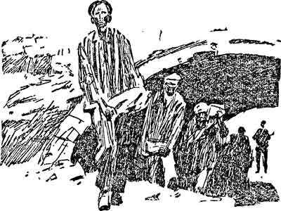 Часовой б ближней наблюдательной вышки следил за полуголыми узниками, кутаясь в шубу.