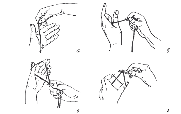 Чтобы правильно набрать петли, следует сначала отмерить нить в 2–3 раза длиннее ширины детали изделия, которую вы будете вывязывать. Нить размещают на указательном пальце левой руки, пропустив ее между указательным и средним пальцами. Другой конец нити оборачивают вокруг большого пальца и фиксируют легким прижатием к ладони (рис. 19, а, б, в). Далее большой и указательный пальцы разводят в стороны, а другой рукой вводят спицы под петлю большого пальца снизу вверх (рис. 19, г). После чего нить захватывают на указательный палец и проводят ее сквозь петлю с большого пальца (рис. 19, д, е, ж). Затем нить сбрасывают с большого пальца и подтягивают вплотную к спицам, образуя петлю нужного размера (рис. 19, з). Так продолжают набор петель до нужного количества. При этом необходимо следить, чтобы набранные петли имели одинаковую длину, в противном случае край изделия будет неровным.