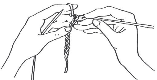 Указательный палец несколько вытянут вперед и лежит на крючке. Крючок поворачивают бородкой влево и движением от себя вводят его под нитку с левой стороны. Оттянув нитку вверх от указательного пальца левой руки, крючок с ниткой поворачивают вокруг нитки на 360 °в сторону, противоположную движению часовой стрелки. Большим пальцем левой руки нитку прижимают к указательному в том месте, где она перекрутилась. Снова вводят крючок под нитку, идущую от клубка с левой стороны, и, поддев ее бородкой крючка, протаскивают через петлю, находящуюся на крючке. Большой палец отнимают, придерживают кончик нитки и затягивают узелок. Это 1-я петля.