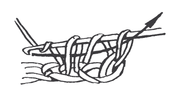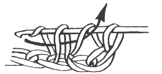 Бугорок. Вяжут из 5-ти столбиков с накидом на 1-й петле основания. Связав 5-й столбик, крючок вынимают из петли, вводят его в петлю 1-го столбика, поддевают только что снятую петлю и протаскивают ее сквозь петлю 1-го столбика.