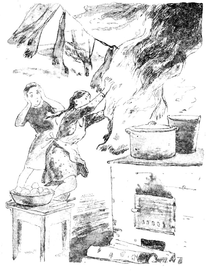 Но не растерялась Ксюша. Она кинула нож в ведро и в два шага оказалась у плиты, Прежде всего сдернула скатерть, швырнула ее на стол. Потом сорвала ближнее, тлеющее с конца полотенце, обернула им руку и одно за другим сбросила на пол горящие полотенца. Схватила у порога мешок из-под картофеля и, набросив его сверху, затоптала пламя.