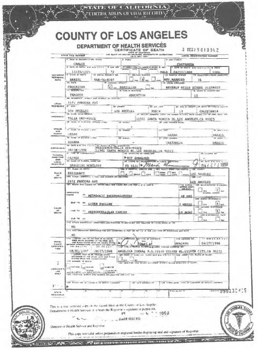 Свидетельство о смерти Карлоса Кастанеды.