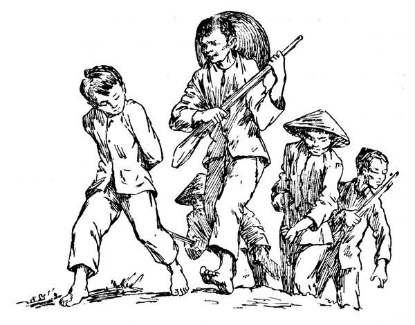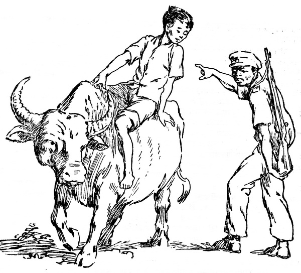 Все так знакомо и так неожиданно. Учительница-партизанка в одной руке держит нон, в другой камышовую корзинку и очень интересно рассказывает, как партизаны бьют врага. Рядом, на столе, лежит новая винтовка. Когда прилетают самолеты, учительница отводит детей в убежище, а сама руками, выпачканными мелом, берет винтовку и целится в самолеты.