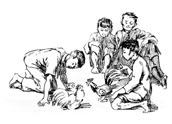 Мальчишки о чем-то пошептались с хозяином нового петуха, и Шо увидел, что вся компания направляется к нему. Они столпились возле белого красавца и опять принялись ругать размазней и дармоедом, а в довершение заявили, что он, видимо, труслив, как краб, и что единственное, но абсолютно бесполезное его достоинство – красивые перья.