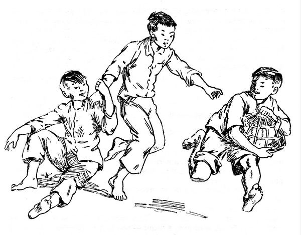 После долгой беготни Шо удалось наконец настичь соперников и запихать своего петуха в плетенку. Он облегченно вздохнул и обратился к Тыоку: