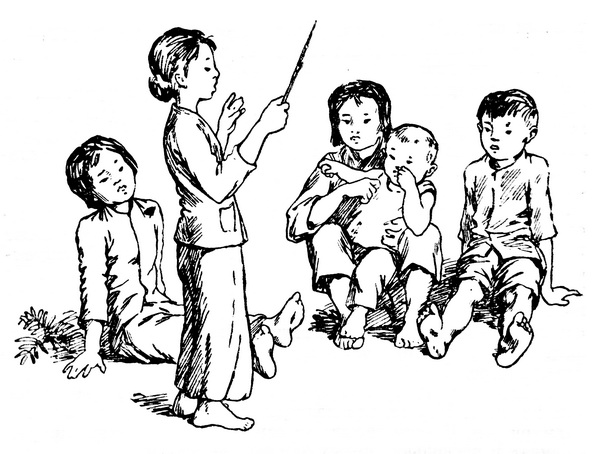 Бабушка Шау позвала их есть, но Малышке не хотелось кончать урок, и, повысив голос, она продолжала «читать». Ань, побоявшись отстать, тут же выпустила Хиена. Он сразу перестал хныкать и принялся старательно вторить Малышке.