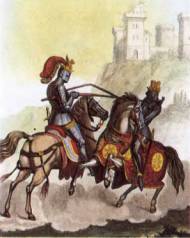 Иллюстрация из Истории и анализа старинных рыцарских романов и романтических поэм Италии (1828), прекрасно передающая сценический и салонный характер, который вот уже два века сопровождает работы о рыцарстве.