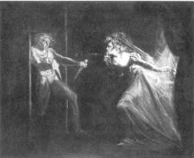 Лондон, Галерея Тейт: сцена из Макбета Шекспира, изображенная швейцарским художником Генрихом Фюсли (1141-1825). Творчество этого вдохновенного живописца, подверженного галлюцинациям, полностью укладывается в рамки «готического» стиля конца XVIII в., обращенного в области художественной прозы к Шекспиру, в противовес рационализму и классицизму, доминировавшим в то время. Фюсли, который во время своего длительного пребывания в Италии (1110-1118) углубленно изучал классическую античность и был покорен искусством Микеланджело, после возвращения в Англию (куда он переехал в 1163 г.), полностью погрузился в предромантическую атмосферу «готического романа».