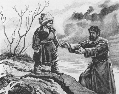 Мишатка испуганно взглянул на него и опустил глаза. Он угадал в этом бородатом и страшном на вид человеке отца...