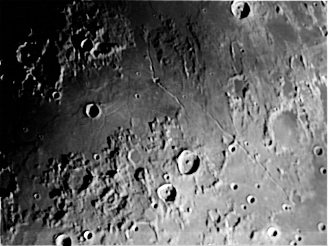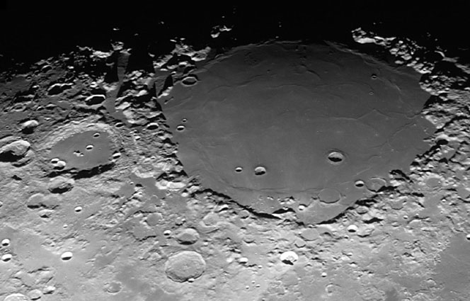 В гористой области, расположенной юго-восточнее перечисленных кратеров, найдите кратеры с центральными горками. Из них типичны Эрстед, Франклин, Гемин, Клеомед. Из кратеров с ровным дном наиболее примечателен Гаусс, расположенный вблизи края лунного диска. Его поперечник превышает 130 км.