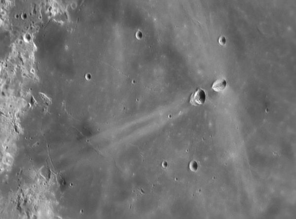 Внешне он напоминает хвост кометы или луч прожектора и, несомненно, образован веществом, выброшенным из Мессье А. Кстати сказать, детальные исследования этого необычного кратера показали, что «жерло» кратера Мессье А направлено не вертикально вверх, а подобно жерлу пушки, наклонно к горизонту. Пожалуй, в этом случае светлое вещество могло быть лишь извергнуто из лунных недр – при падении метеорита и его последующем взрыве выброс лунного грунта происходил бы во все стороны примерно равномерно. О кратерах-близнецах Мессье существует обширная литература. При разных условиях освещения они видны по-разному и долгое время многие наблюдатели были уверены, что в данном случае речь идет о реальных изменениях лунного рельефа, происходящих буквально на глазах. На самом деле в этой иллюзии повинна игра света.
